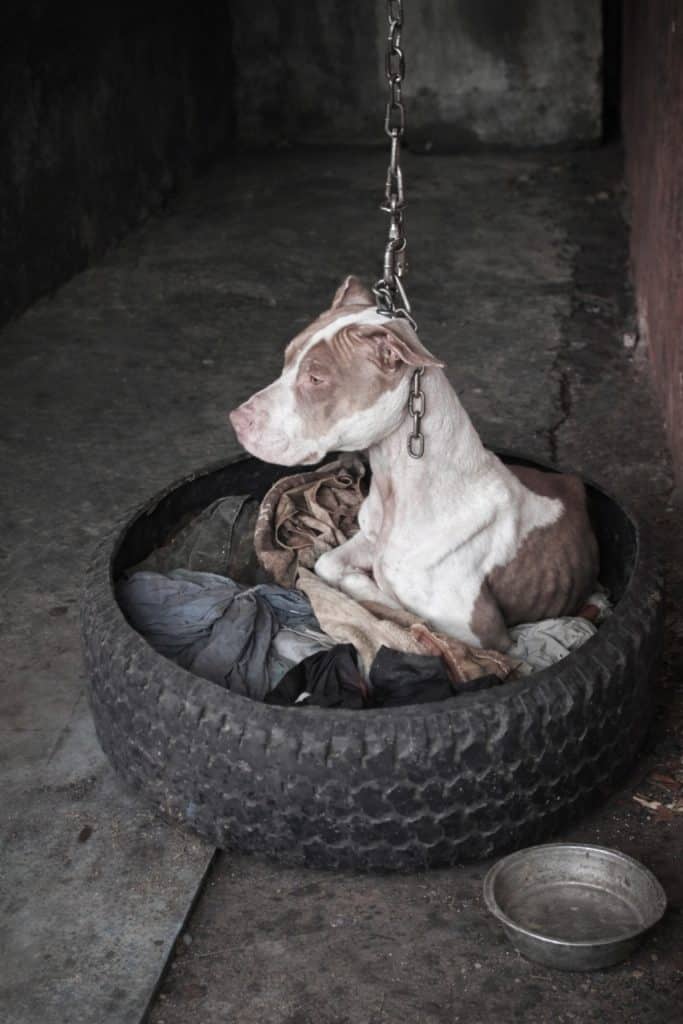 She spent her days sitting in the same position, leaning against an old tire for support. Around her neck was a short metal chain fixed tightly to a post. The chain was so restrictive that she could not lower her head to the ground. Even rest—something every animal instinctively needs—was denied to her.