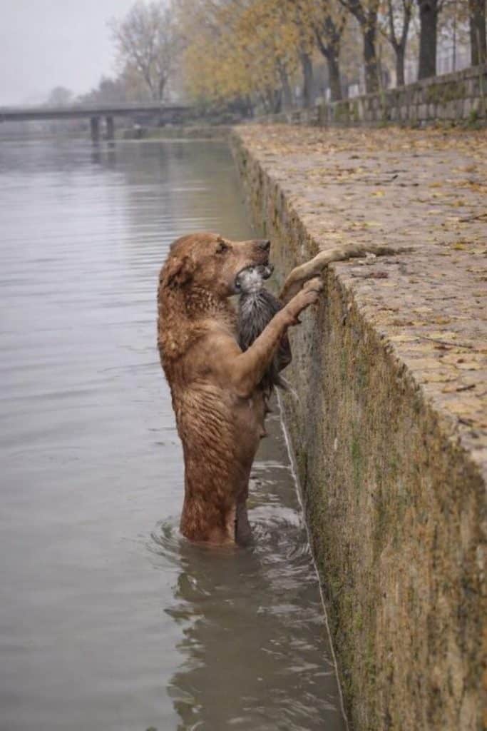 By the time the water reached her, the mother dog was already exhausted. Her coat clung to her body, soaked and heavy, while the current pulled at her legs with relentless force. With no dry ground left, she pressed herself against a concrete wall, bracing her hind legs beneath the surface and stretching upward for balance. Held gently in her mouth was her newborn puppy—tiny, fragile, and completely dependent on her strength.
