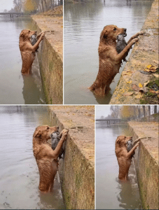 The cold seeped into her muscles, numbing her body and slowing her movements. Still, she did not panic. She adjusted her grip instinctively, careful and precise, keeping her puppy safe as the water surged around them. Her eyes stayed focused and alert, conserving energy, trusting instinct over fear. In that moment, nothing mattered except one simple purpose: keeping her baby alive.