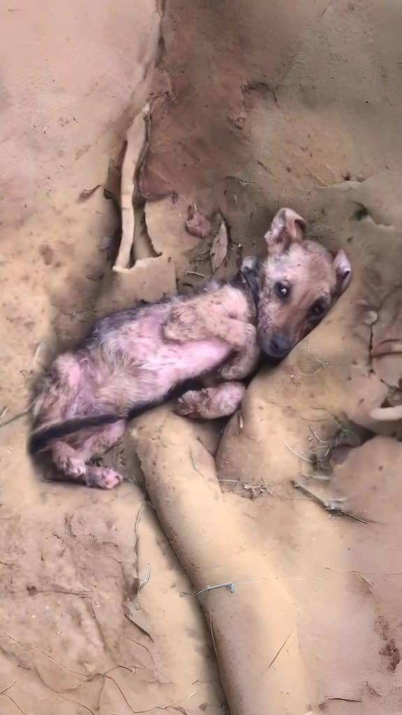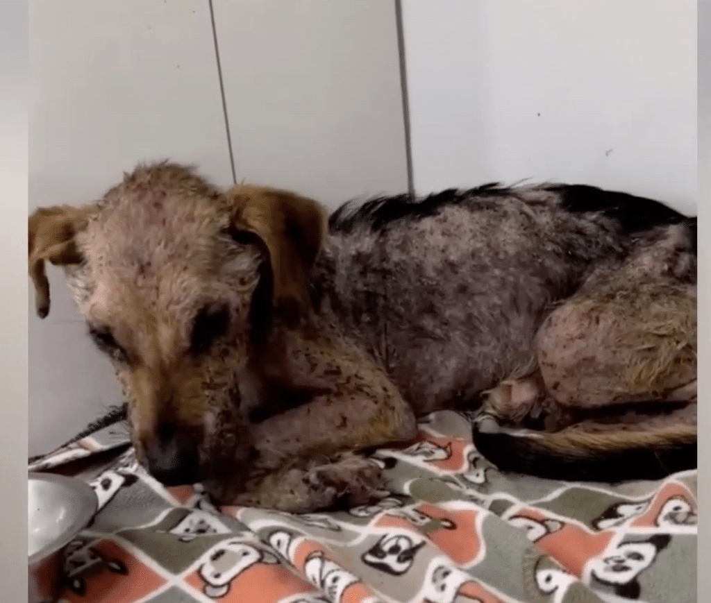 When rescuers finally found her, the sight was heartbreaking. Bia lay curled tightly against the cold ground, her thin body barely protected from the elements. Her skin was inflamed and raw from untreated mange, patches of fur missing entirely. Each breath was shallow, measured, as though breathing itself required effort.