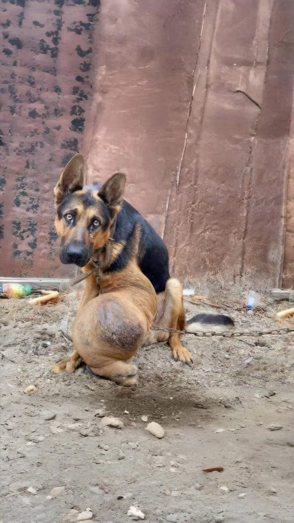 Help arrived quietly, through a message shared with rescuers about a dog living in unimaginable conditions. When they found Jordan, he was weak and trembling, barely able to support himself. His body told the story of years of neglect.