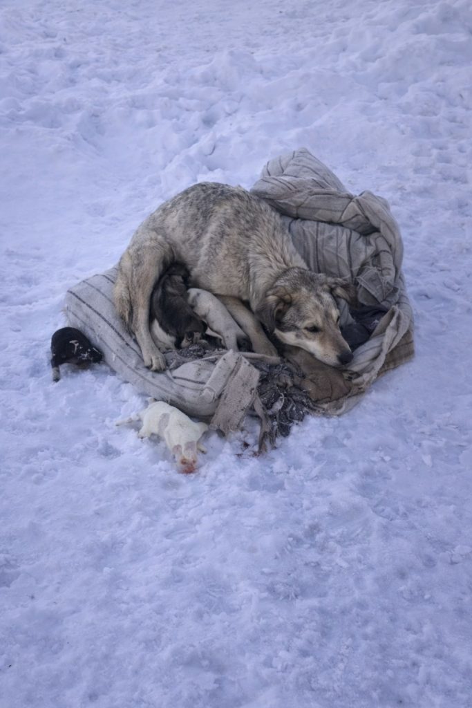 The cold pressed in immediately. Snow soaked into their fur, stealing heat faster than their small bodies could produce it. Instinct drew the puppies close together, pushing them toward their mother’s chest. Their cries were faint, almost lost in the wind, but filled with urgency. They were far too young to survive such conditions on their own, and every passing minute made the situation more dangerous.