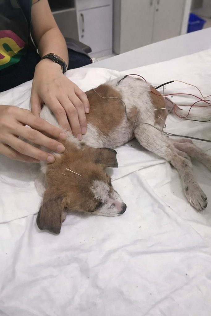 Healing began slowly and with intention. Acupuncture was introduced to help reconnect his body and mind, and from the very first session, Toby surprised everyone. He accepted the treatment calmly, showing a level of trust that felt almost impossible given his past. Tiny responses followed—a muscle twitch, a slight shift in posture. These moments were quiet, but they meant everything.