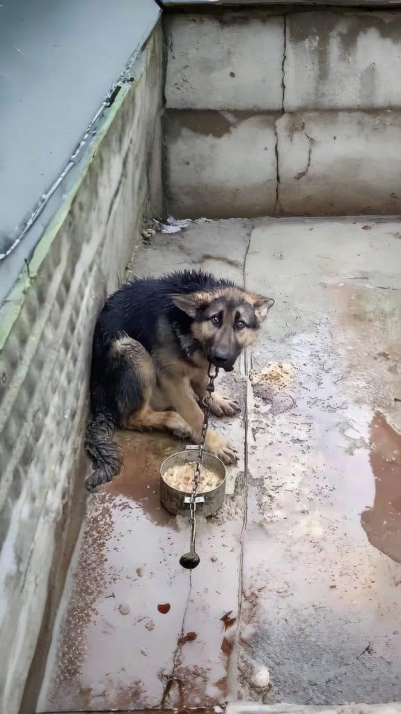 A woman living nearby had heard the cries before. At first, she tried to believe someone must be caring for him. But as days passed, the sounds grew weaker. One morning, she looked out her window and saw Alpha trembling against the wall, rainwater pooling beneath him, the chain cutting into his neck.