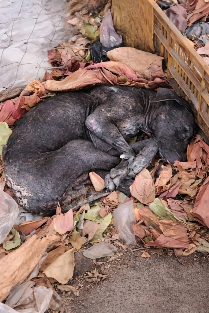 A sanitation worker noticed him during routine rounds and slowed to take a closer look. From a distance, the dog appeared motionless. As footsteps approached, he lifted his head just slightly. There was no barking, no attempt to flee—only a tired, searching gaze. It was the look of a dog who had endured far more than a single bad day. His condition spoke of long-term neglect, not sudden misfortune.