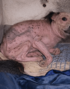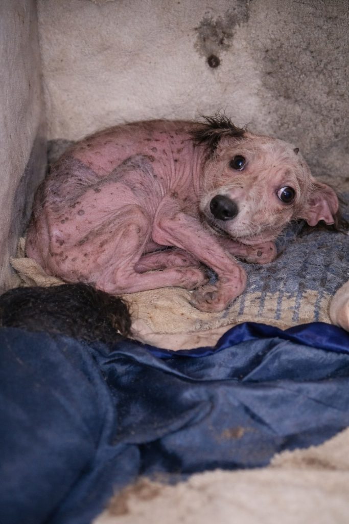 When Dobi was first found, it was clear that life had been unbearably heavy on him. He didn’t bark for attention or try to run. He didn’t have the strength. Instead, he pressed his small body into the farthest corner he could reach, curling inward as if hoping to disappear. His frame was thin, weakened by long-term neglect and illness, and every breath seemed careful and controlled. But it was his eyes that stayed with people the longest—wide, fearful, and carrying the quiet weight of endurance.