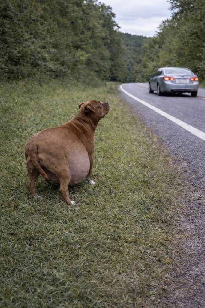 She was easy to overlook, just another quiet presence along the roadside. A stray mother dog, heavily pregnant, moving with slow, careful steps as her swollen belly nearly brushed the ground beneath her. Every movement took effort. Every pause carried uncertainty. She lingered near the edge of the road, watching passing cars with tired eyes, as if one of them might bring an answer—or at least a moment of kindness.