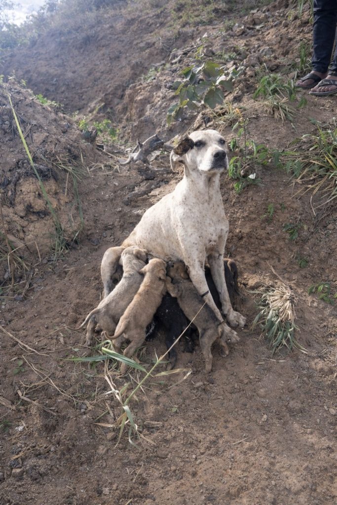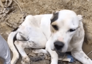 When the rescue team arrived, they found her lying motionless on the hard ground. Later, she would be named Aisha. She was painfully thin, her body weakened by hunger and exhaustion. Her coat was dull and matted, and every attempt to move looked uncertain. Most striking were her eyes—clouded with confusion, sadness, and a quiet sense of loss. And then there was what wasn’t there. Her puppies were gone.