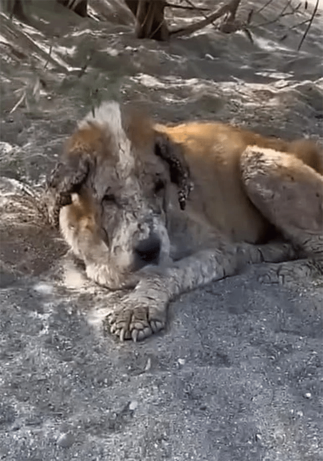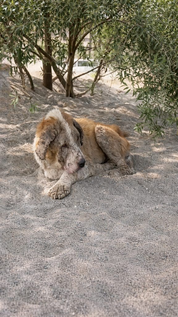 Her body told a painful story. Severe scabies had taken hold of her skin, especially around her face, ears, and legs, leaving her uncomfortable and exhausted. Her coat was thin and patchy. Her frame fragile. Often, she lay on the sand for hours at a time, as though resting was the only thing she could manage anymore.