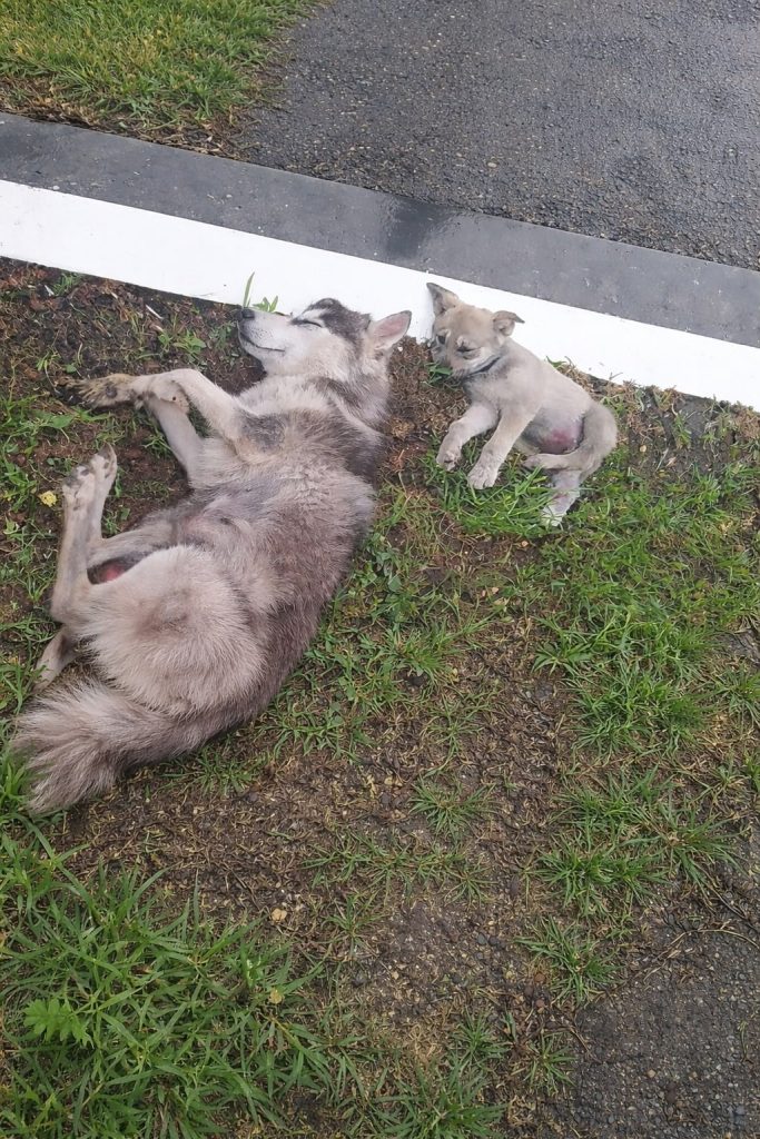 A mother dog lay motionless near the pavement. A husky mix with gentle eyes, she had been struck by a passing car and knocked unconscious. Beside her stood her puppy—small, frightened, and confused. He cried softly, nudging her body, trying again and again to wake her. He didn’t understand why she wasn’t responding. He only knew she was supposed to be there.