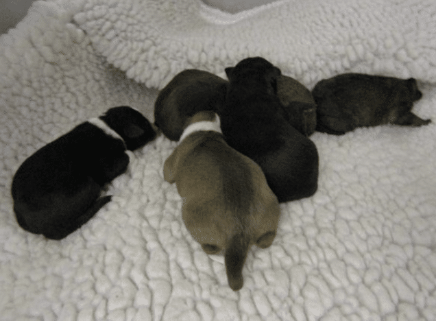 Pressed close against her body lay six newborn puppies, their eyes still closed, completely dependent on her warmth and care.