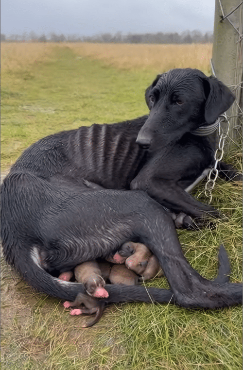 Her ribs showed clearly beneath her coat, and her strength was fading. Yet her instinct to protect her babies never wavered. Against hunger, exposure, and isolation, she stayed exactly where she was tied — because leaving was never an option.