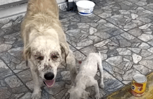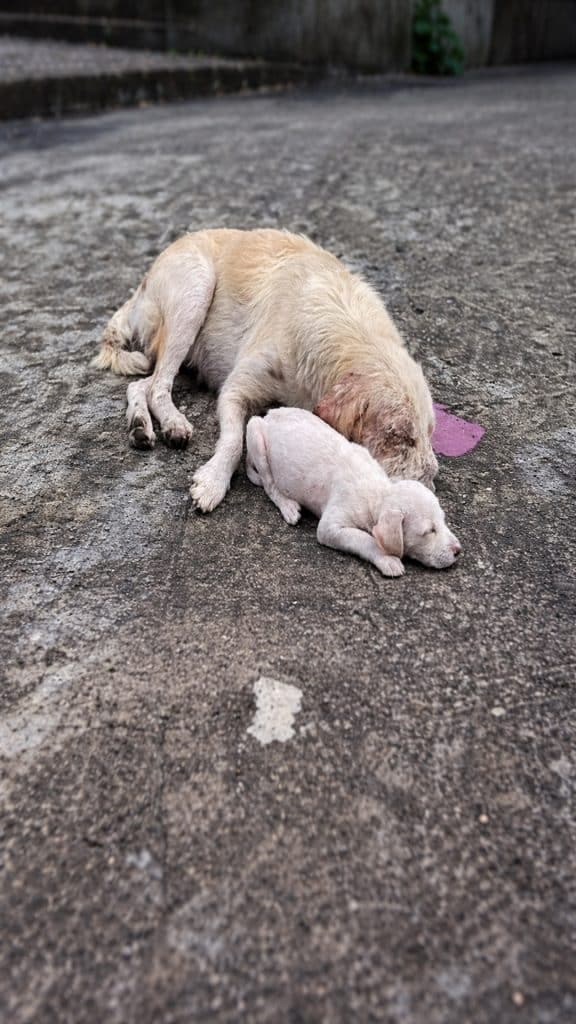 They were rushed to a nearby veterinary clinic, where the seriousness of their condition became clear. Ala was suffering from severe malnutrition and illness, and her tail injury required immediate surgery. Mafa, too weak to defend himself, needed medical care and nourishment. IV fluids were started, medications administered, and gentle hands worked to stabilize both mother and puppy.