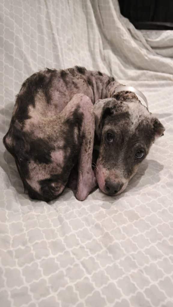 The puppy was later named Ziva, and her condition told a difficult story. At just eight months old, she arrived at a shelter weighing barely twelve pounds. Her body was weak. Her coat was patchy. Her skin showed clear signs of long-term neglect. She had been living chained to a tree, with little protection from the elements, lying on rough ground day after day.