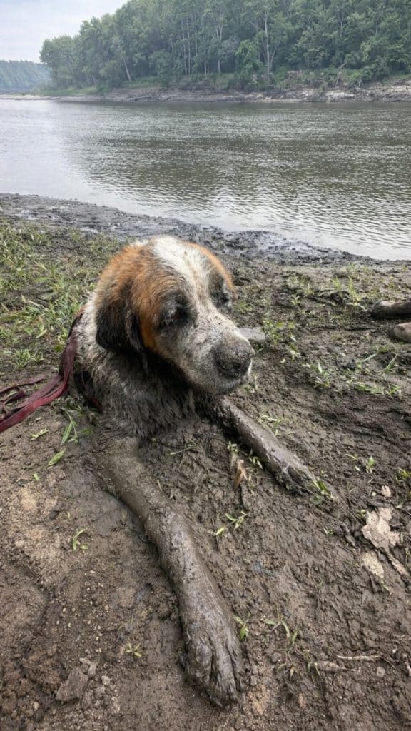 At first, it was hard to tell what they were seeing. As they drew closer, the scene became clear — an older dog, stuck deep in thick mud, struggling with every ounce of strength it had left. Each attempt to move only pulled the dog deeper. Mud clung to its body. Its breathing was heavy. Fear was unmistakable in its eyes.