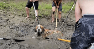 Hands pulled. Muscles strained. Mud splashed. There were moments when it felt like the dog might not come free. But no one gave up. Inch by inch, the team worked together until, finally, the dog was lifted from the mud.