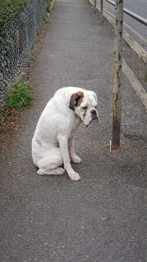 The dog was tied tightly, standing alone on the pavement as traffic rushed past. He was trembling, his body stiff with fear, his eyes fixed on the street as if searching for someone familiar. Every passing car made him flinch. There was no one nearby. No sign of an owner. Just a dog waiting, confused and exposed to the cold.