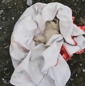 Speaking softly, Mr. Xiong moved closer. The puppy didn’t resist. Exhaustion had taken over—physical and emotional. Wrapped carefully in a cloth, the puppy allowed itself to be lifted away from the road for the first time. It didn’t struggle. It only looked back once, as if trying to memorize the place where it had last stood beside its friend.