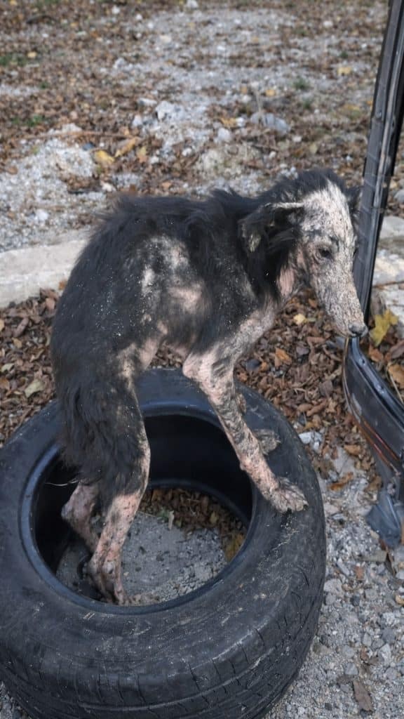Neve’s body told the story of hardship. Her coat was thin and patchy, her skin marked with small wounds that spoke of long-term neglect. She moved carefully, conserving energy, never straying far from the tire that had become her refuge. A few compassionate neighbors left scraps of food nearby, hoping it would help her survive another day. Others, unaware of how close she was to giving up, chased her away. As winter deepened, concern grew among those who cared. It was clear that Neve could not survive much longer on her own.