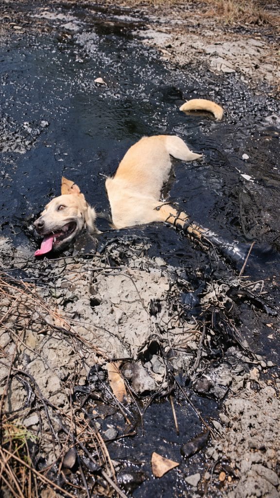 After intense effort, the team freed the dog from the largest portion of the rubber. But the danger wasn’t over. Thick residue clung to his fur and skin, threatening discomfort and further complications. The exhausted dog—now named Mali—remained surprisingly calm, as if sensing that the people around him were there to help.
