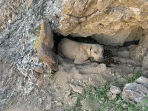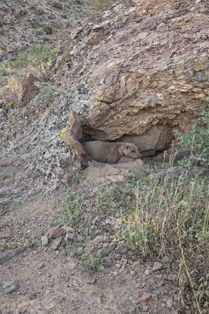 Carefully, the hiker stepped closer. Tucked tightly between the rocks was a dog, her coat blending almost perfectly with the desert landscape. She was so still, so well camouflaged, that without her eyes, she might never have been seen at all. Those eyes told everything—exhaustion, suffering, and a quiet hope that someone had finally noticed.