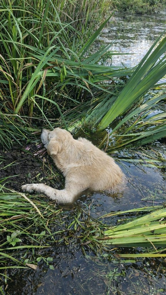 Hoping, at the very least, to check, the search began along the winding edge of the river. Hours passed. The water moved quietly. Doubt crept in. And then — movement. In the shallow current, a dog struggled weakly, his body exhausted, his strength nearly gone. He was trapped, unable to pull himself free. His eyes told the story before anything else could — fear, confusion, and a quiet plea for help.