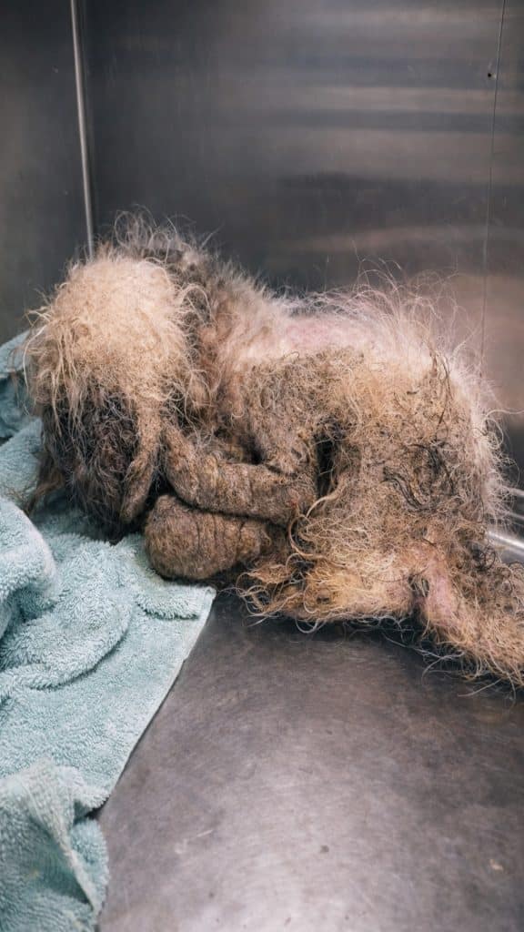 Up close, Parker’s condition told a painful story. Her fur was tightly matted, limiting her movement and hiding what lay beneath. Her nails had grown long and uncomfortable, making it hard for her to stand properly. Untreated infections had taken hold, clear evidence that her needs had gone unmet for a very long time.