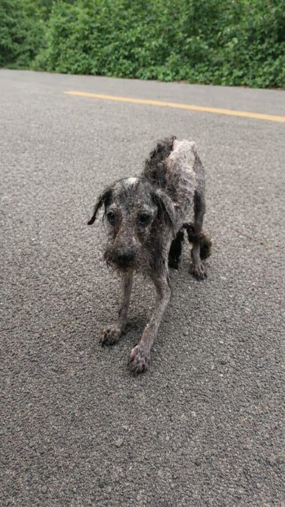 His body told a clear story. Ribs pressed sharply beneath a dirty, tangled coat. His posture was guarded, shaped by hardship and uncertainty. And yet, despite the exhaustion weighing him down, he kept moving.