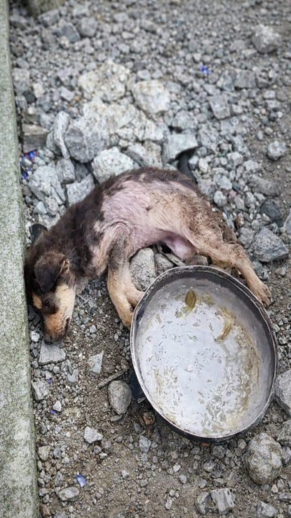 His body was frail, stretched out on the ground as though even lifting his head required more strength than he had left. His breathing was shallow. Beside him sat an empty food bowl — untouched, waiting. It told a silent story of days spent hoping for care that never came.