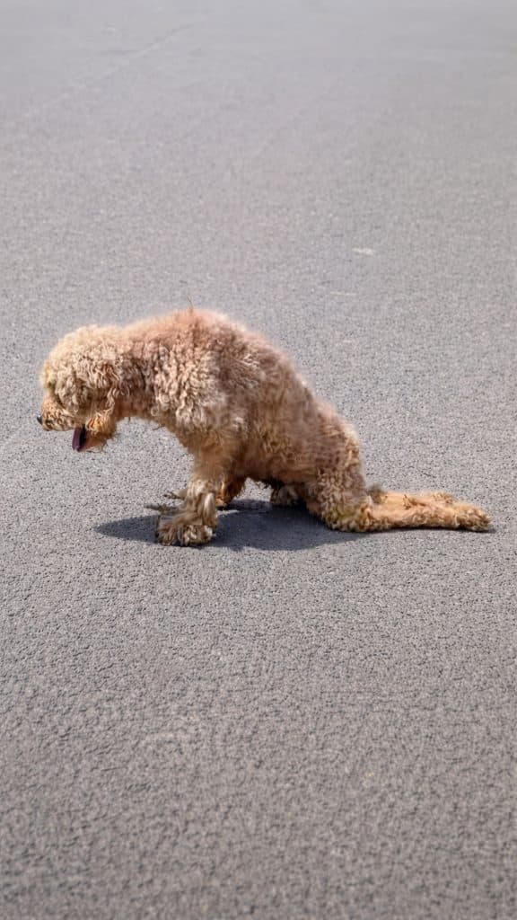 A man driving past noticed the dog struggling along the road. Something about the sight stayed with him. He pulled over, stepped out, and approached carefully, not wanting to frighten him.