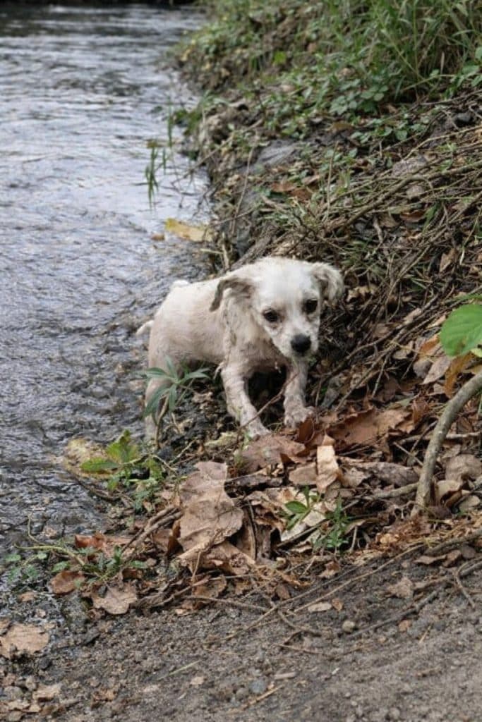 It was an ordinary afternoon by the river, the kind where time seems to slow and nothing feels urgent. A fisherman stood along the bank, focused on the gentle movement of the water, when something unexpected caught his eye. In the tall grass across the river, a small dog appeared—thin, cautious, and clearly worn down by life outdoors. The dog moved slowly, as if unsure whether it was allowed to exist in this peaceful place at all.