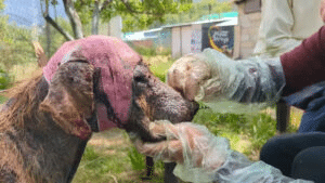 When the rescue team first encountered the dog, his condition told a story without words. Raw, irritated skin covered much of his body, a clear sign of long-term neglect. Each step he took seemed heavy, as if his strength had slowly been drained over time. Yet behind the frailty, there was something steady in his gaze—a quiet determination that hinted he hadn’t given up.