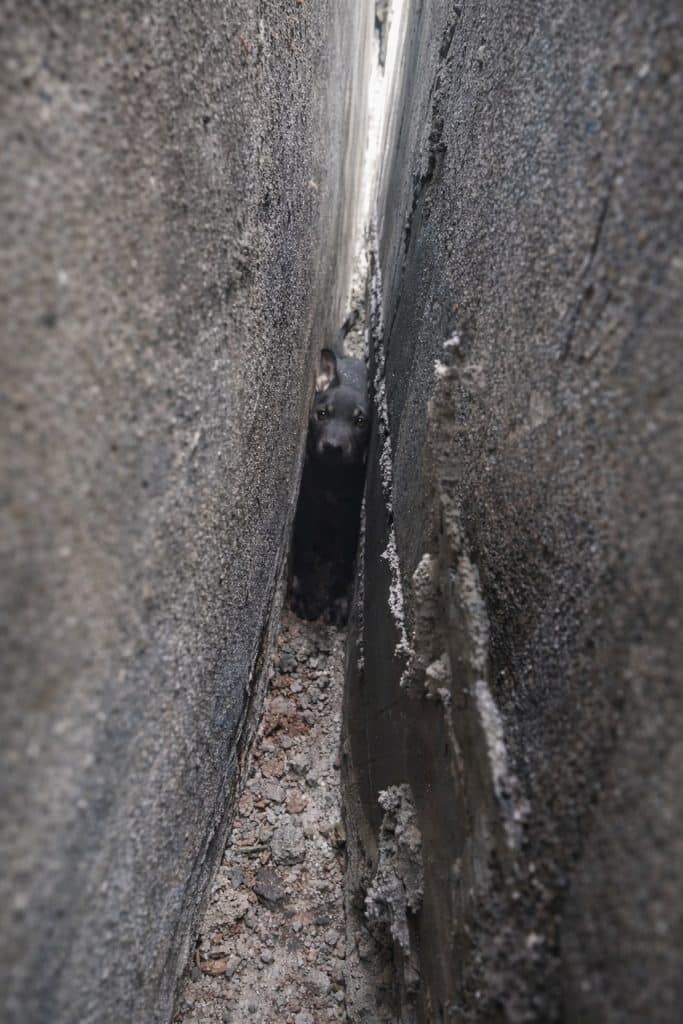 Then, just as hope began to thin, someone stopped. A passerby heard a faint sound coming from between the walls and chose to look closer. Realizing an animal was in trouble, they called for help. When rescuers arrived, they found Lucky’s small body tightly wedged in the gap, unable to move. His fear was visible, but so was his will to hold on.