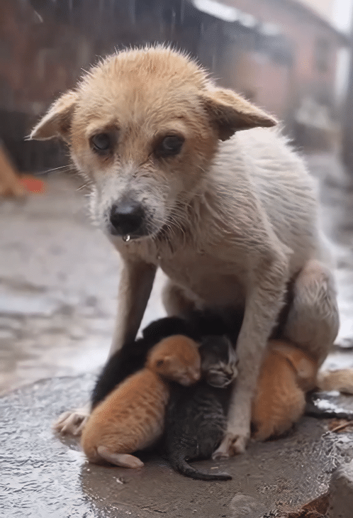 A thin stray dog lay curled protectively around three kittens.