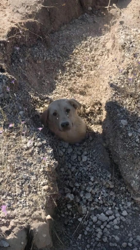 A mother dog lay partially buried, her head barely above the ground. Her body was pinned beneath the earth, exhausted and trembling. Yet her eyes were open and alert, filled with fear—but also determination. She was still holding on.
