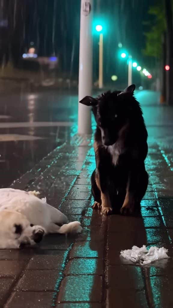 A white dog lay stretched out on the cold ground, soaked and barely moving, its body rising and falling with slow, shallow breaths. Sitting beside it was a black dog, upright and still, eyes fixed forward. Rain pooled around their paws, but the black dog did not flinch.