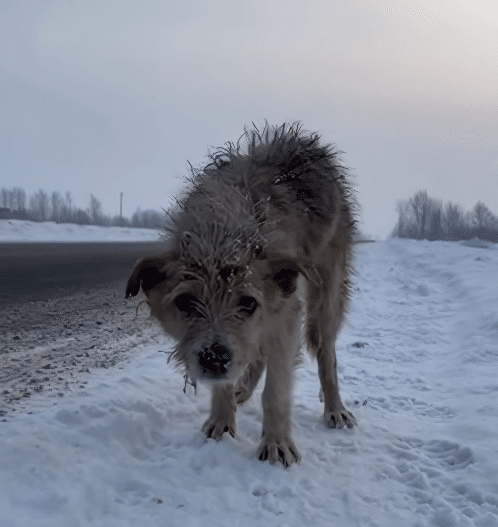 On a quiet winter morning, when fresh snow muted the world into stillness, a passerby noticed something that didn’t belong. Near the edge of an almost empty road, a dark shape lay pressed against the white ground. From a distance, it looked like debris left behind by the storm. But as someone stepped closer, the truth became impossible to ignore. It wasn’t trash. It was a dog—small, tightly curled, and trembling, as if trying to disappear into the cold.