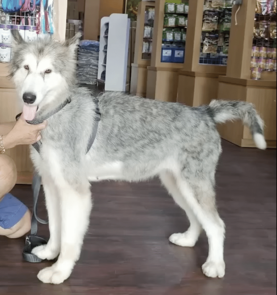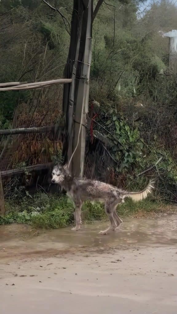 Tied to an old metal post, barely shielded from the downpour, lay a thin Husky mix. His fur was soaked through, clinging to a frail body that trembled with cold. He didn’t cry out. He didn’t struggle. He simply endured, curled tightly against the wet ground as if waiting was all he knew.