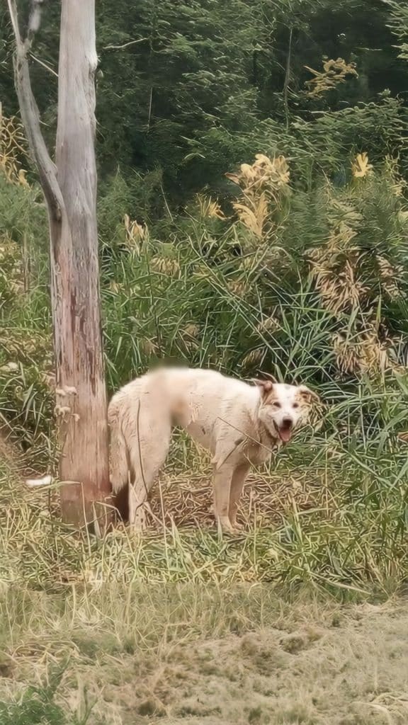 Some stories don’t arrive with noise or urgency. They slip in quietly and stay. This one began with a single image: a thin dog standing beside a tall wooden post, tethered tightly beneath the harsh afternoon sun.