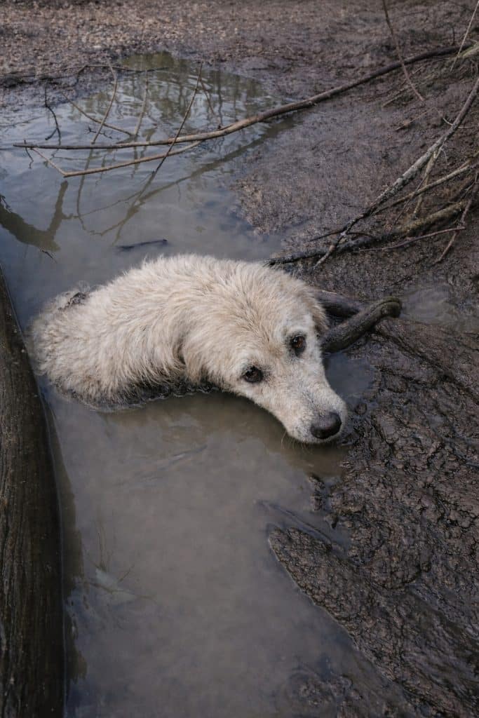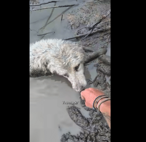 Partially hidden beneath a fallen log was a dog, trapped deep in heavy mud. Only his head and part of his chest were visible. His legs were completely buried, locked in place by thick ground that tightened with every movement. His fur was soaked and matted. His body trembled from exhaustion. His eyes were open—but dull, as if he had been there long enough to accept what might come next.