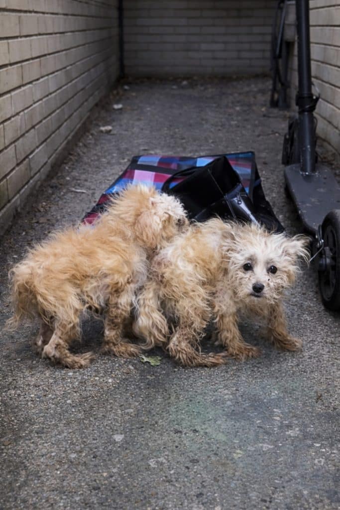 Tucked into the dim corner of a quiet street, two tiny puppies pressed themselves tightly together, as if shrinking might make the world forget they were there. Their bodies curled inward, noses buried into fur so matted and heavy it barely resembled a coat anymore. Dirt, dust, and neglect had clung to them for so long that, at first glance, they didn’t even look alive. To most people passing by, they blended into the curb like discarded debris.