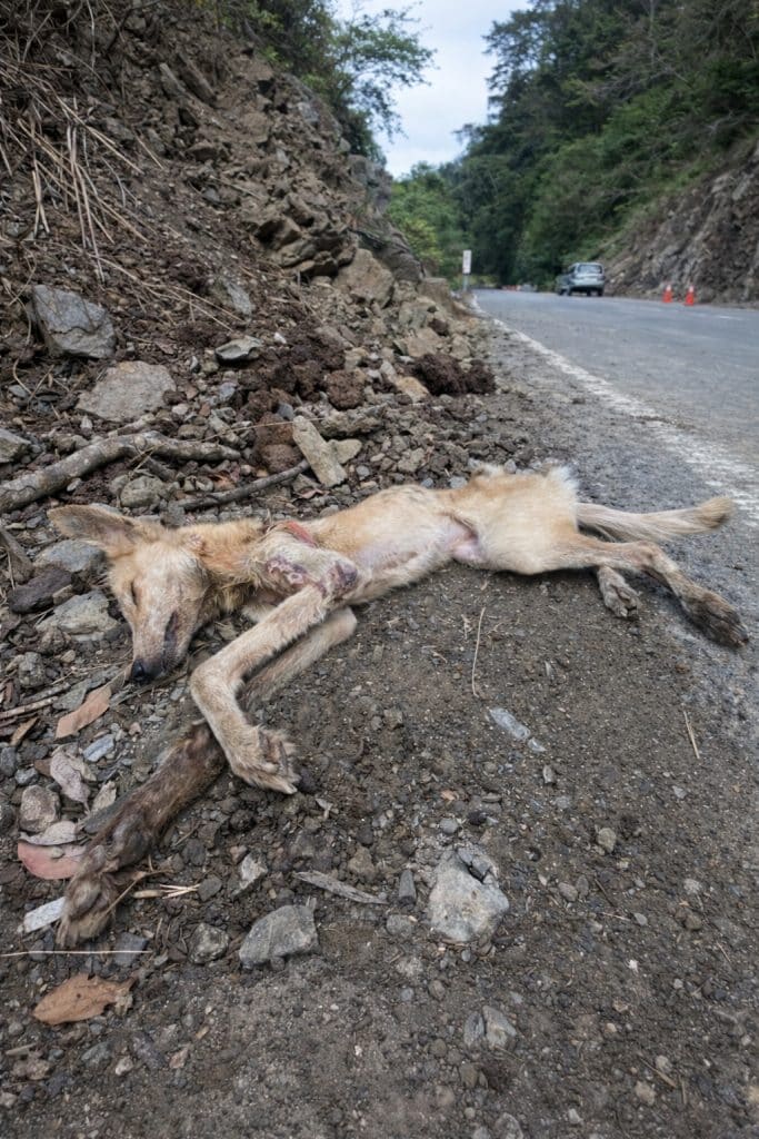 A driver noticed something by the roadside that didn’t move. Instead of looking away, they slowed down. They pulled over. When they stepped closer, the truth became impossible to ignore — not debris, not a resting animal, but a life barely holding on.