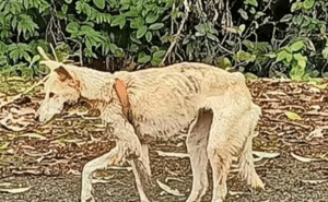 His fragile body told the story clearly. He was dangerously thin. His coat was dull and neglected. Old wounds marked his skin. And his front leg — crushed in a violent accident — hung useless and swollen. Any attempt to move sent sharp pain through his body, so he stayed still, conserving what little strength remained.
