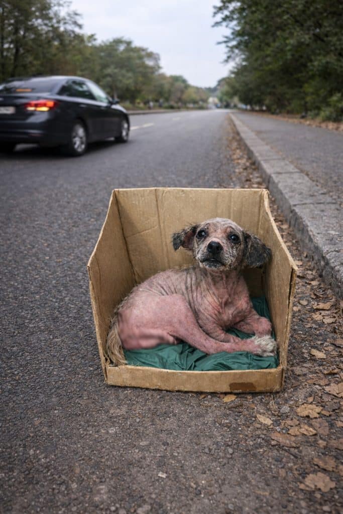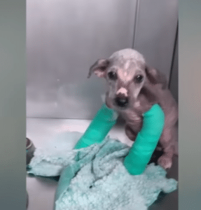 Much of her fur was missing, leaving her skin exposed and sensitive. Her body was thin and fragile, lacking the strength puppies her age usually have. Most concerning were her front legs. They were visibly misshapen, making it difficult for her to stand or take even a few steps without discomfort.