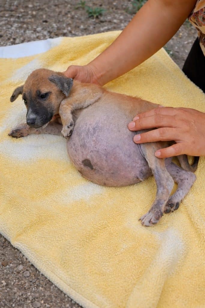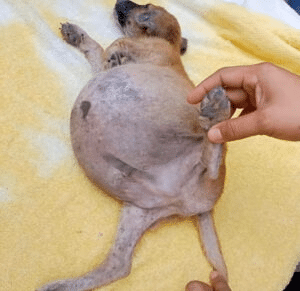 It was round and tight, far too large for a puppy so young, making even the smallest movement uncomfortable. When staff gently lifted him, he barely reacted—conserving what little strength he had left.