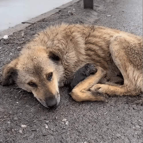 Curled against the dusty shoulder lay a mother dog, her body thin and drained of strength. Her breathing was shallow. Her fur, dulled by weeks of hardship, clung to her fragile frame. To passing drivers, she might have looked like nothing more than another shadow along the road.