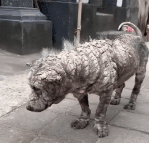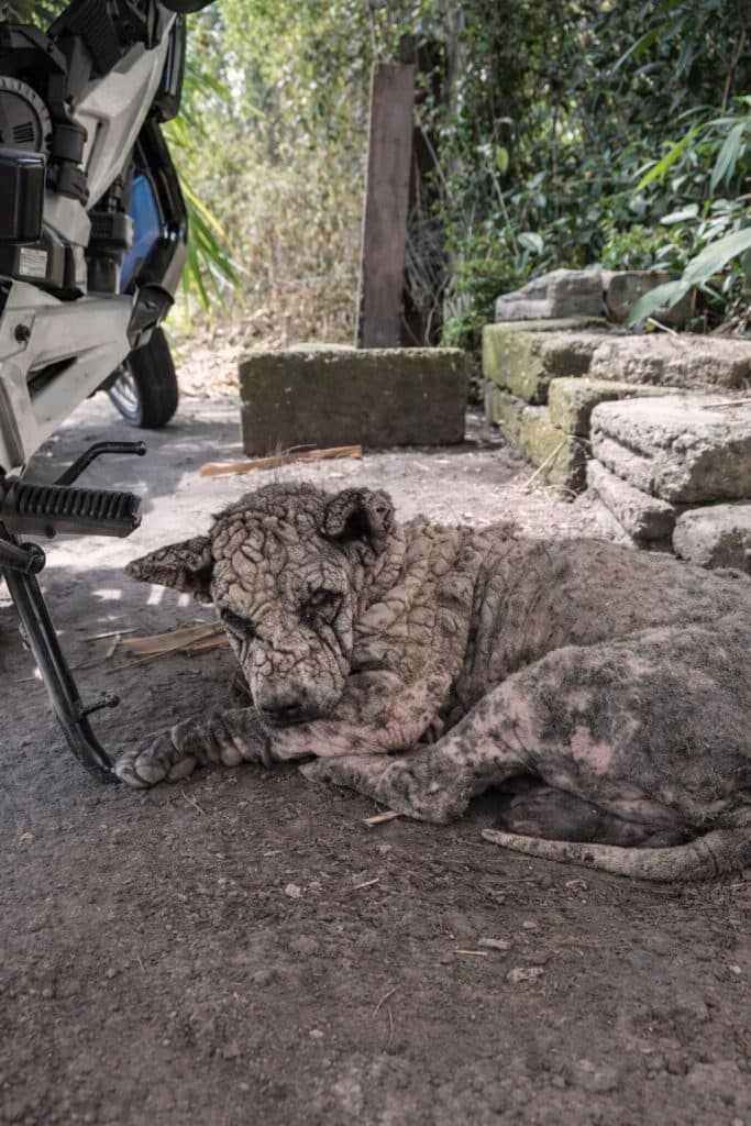 When Poleng was first found, it was difficult to recognize him as a dog at all. His body was covered in thick, hardened layers of untreated skin disease, leaving his movements stiff and his posture heavy with exhaustion. Each step looked uncomfortable. Each breath carried effort.