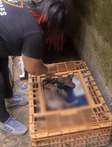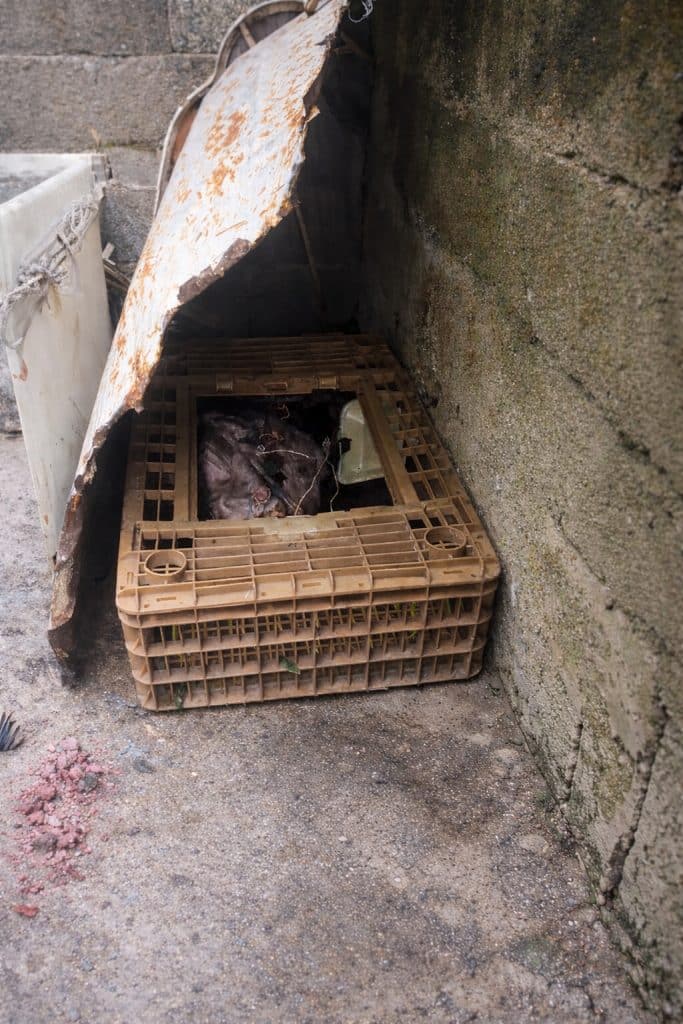She lived hidden from view, confined inside a small plastic crate that barely allowed her to move. Steel wires held it shut. A rusted metal sheet covered the top, blocking out light and air. From the outside, it looked like discarded debris. Inside, a fragile life slowly slipped further away.