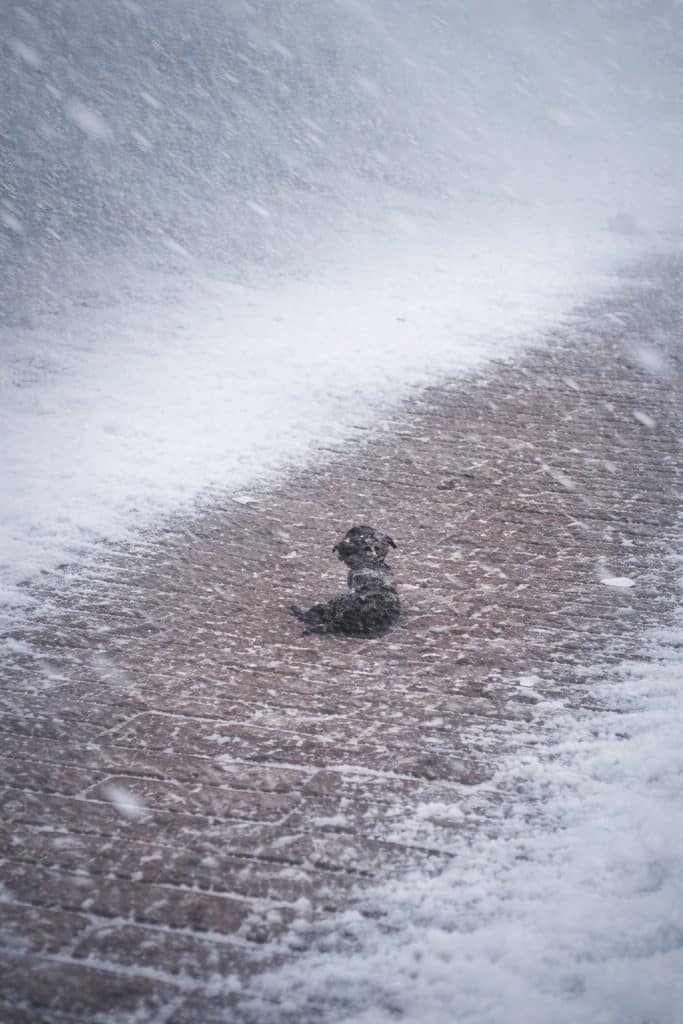 Her small body was stiff from the freezing temperatures. Melted snow had soaked her to the skin. She could not bark or move away. Her wide eyes reflected nothing but exhaustion and fear.