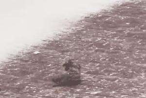 Amid a fierce snowstorm, a cameraman noticed a small shape tucked beneath a parked vehicle.